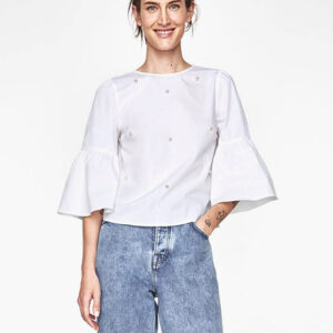 Блузка женская из поплина, для повседневной носки, полуприлегающего силуэта с центральной застёжкой на планке на десять обмётанных петель и десять пуговиц, расположенных группами.